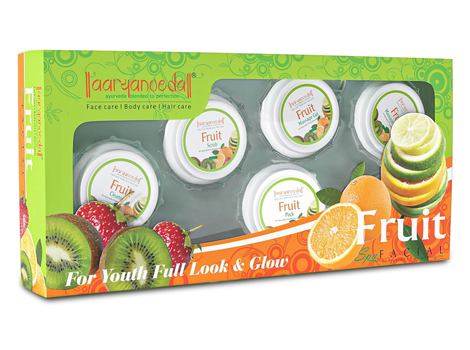 - Natural Glow: Aaryanveda Fruit Facial Kit gives an instant natural glow, and removes fine lines, and wrinkles. This evens reduces dryness of the skin and pigmentation to enhance your natural beauty