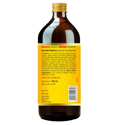 Baidyanath Kankasav is a combination of Dhatura, Vasa, Yasti, Pippali, Kantakari, Nagakesara, Sunthi, Bharangi, Talispatra, Draksa, Sarkara, Madhu, Dhataki in Asav Base.