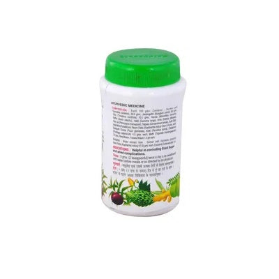 - Gurmar patti(Gymnema sylvestre),Jamnumguthli(Syzygium cumini),Karela(Momordica charantia),Giloy(Tinospora cordifolia),Khadir Churan(Acacia catechu),Haldi (Curcuma longa),Amla(Emblica officinalis),Vijay Sar(Petrocarpus marsupium) Tejpata (Cinnamomum tamala),Gularpatti churna(Ficus glomerata),Kutki (Picrorhiza kurroa),Chitrakmool (Plumbago zeylanicum),Methi(Trigonella foenum-graecum),Sudh Silajit,Tribanga Bhasma,Neem Patta(Azadirachta indica) Churn,Sura (Alcohol),Water extract from Gurmar patti(Gymnema sylvestre),Neem Patta(Azadirachta indica),Excipients -Guar Gum
