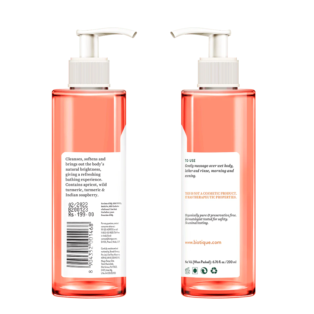 - Enriched with the goodness of Apricot, this refreshing body wash provides natural moisturization, giving you soft and supple skin. The infusion of soap nut ensures hydration and prevents excessive drying, while Turmeric brings its antioxidant properties, brightening your skin and reducing dark spots.