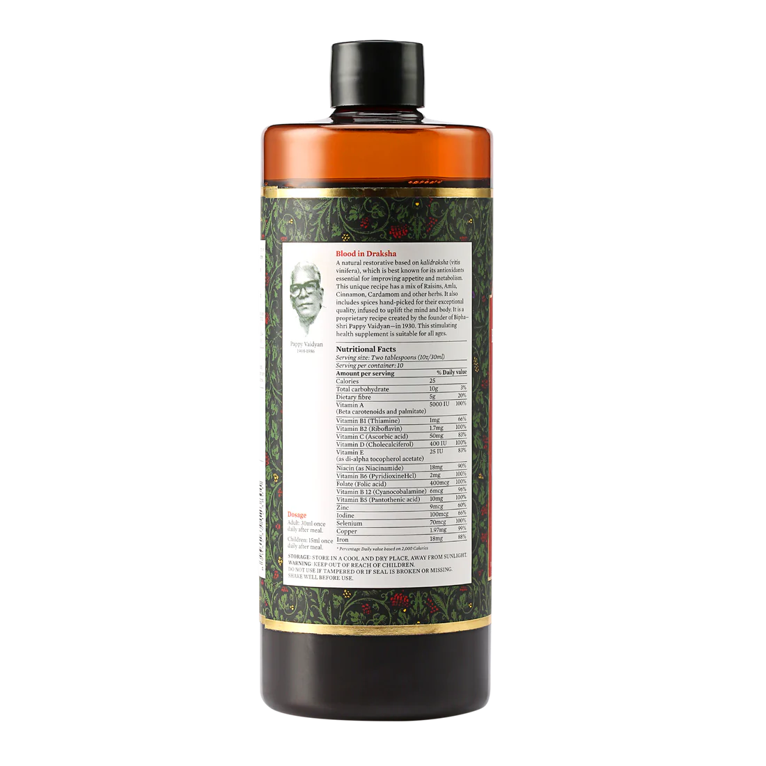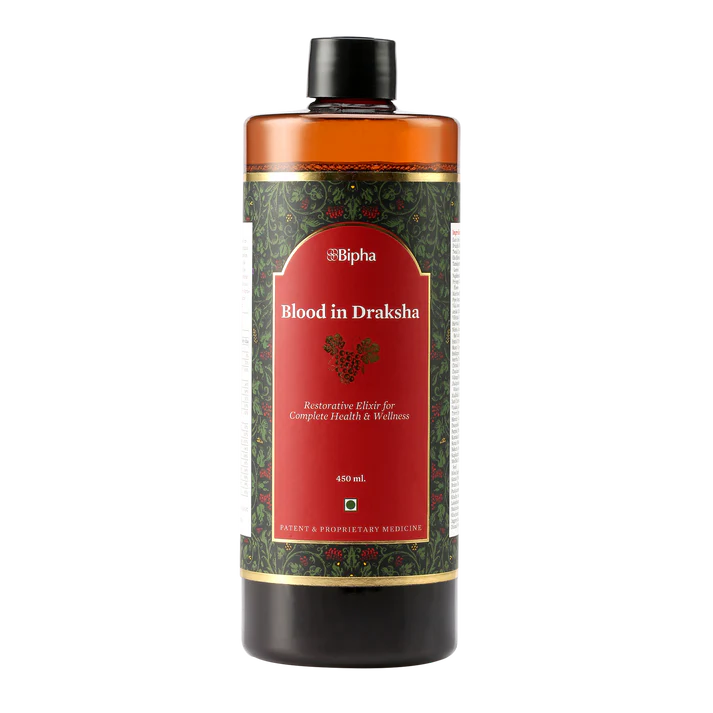 Blood in Draksha is a proprietary recipe developed by the founder of Bipha – Shri Pappy Vaidyan that works as a restorative. This rejuvenating, haematinic and digestive supplement is suitable for physically active people, athletes, growing children, pregnant, elderly, and convalescents.