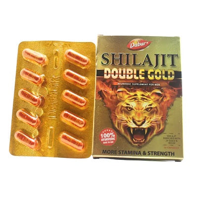 - Dabur Shilajit Double Gold Capsule is an Ayurvedic medicine which uses Shilajit as the active ingredient. Shilajit has been used widely for its ability to improve vigour and vitality, and it is formulated using a combination of unique medicinal plants, including kesar, ashwagandha and safed musli. It helps improve body strength and may also be used for people suffering from low levels of libido.