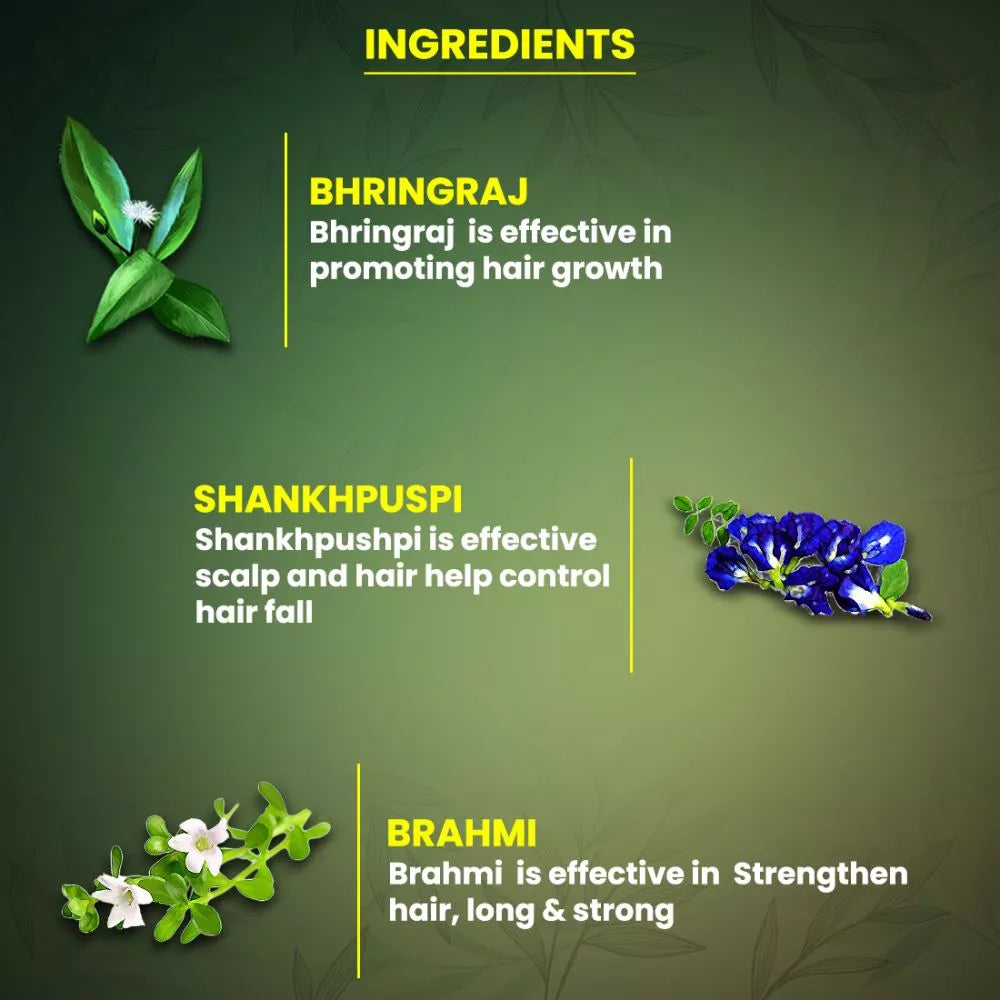 - Ashwagandha,Amala,Bhringaraj,Shankhapushpi,Manjistha, Lodhra, Asana, Bala, Daruhaldi, Nagkesar, Yashtimadhu, Kamal, Anantamul, Bibhitaki, Mehandi, Jatamansi, Brahmi, Nili, Khas, Harad,Till.