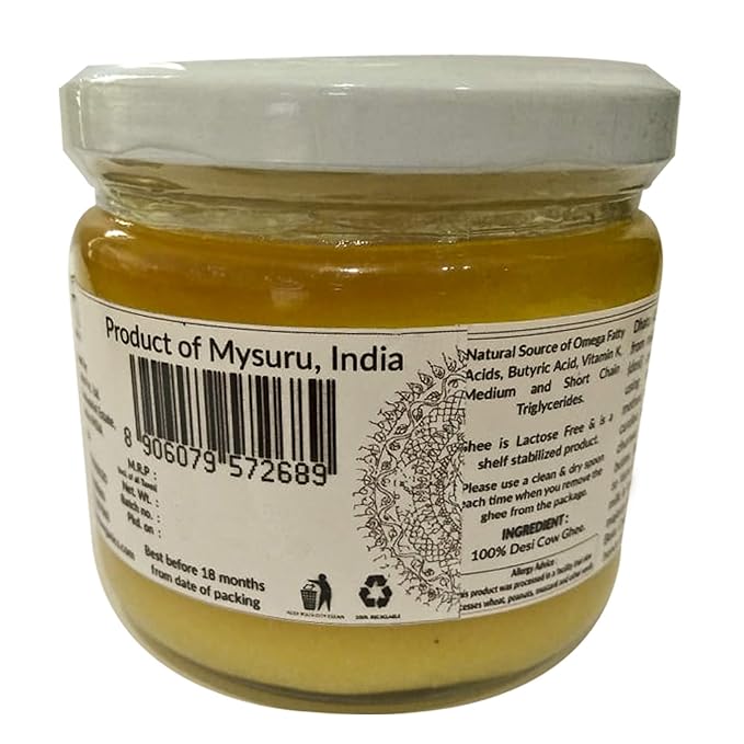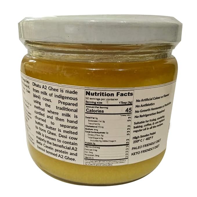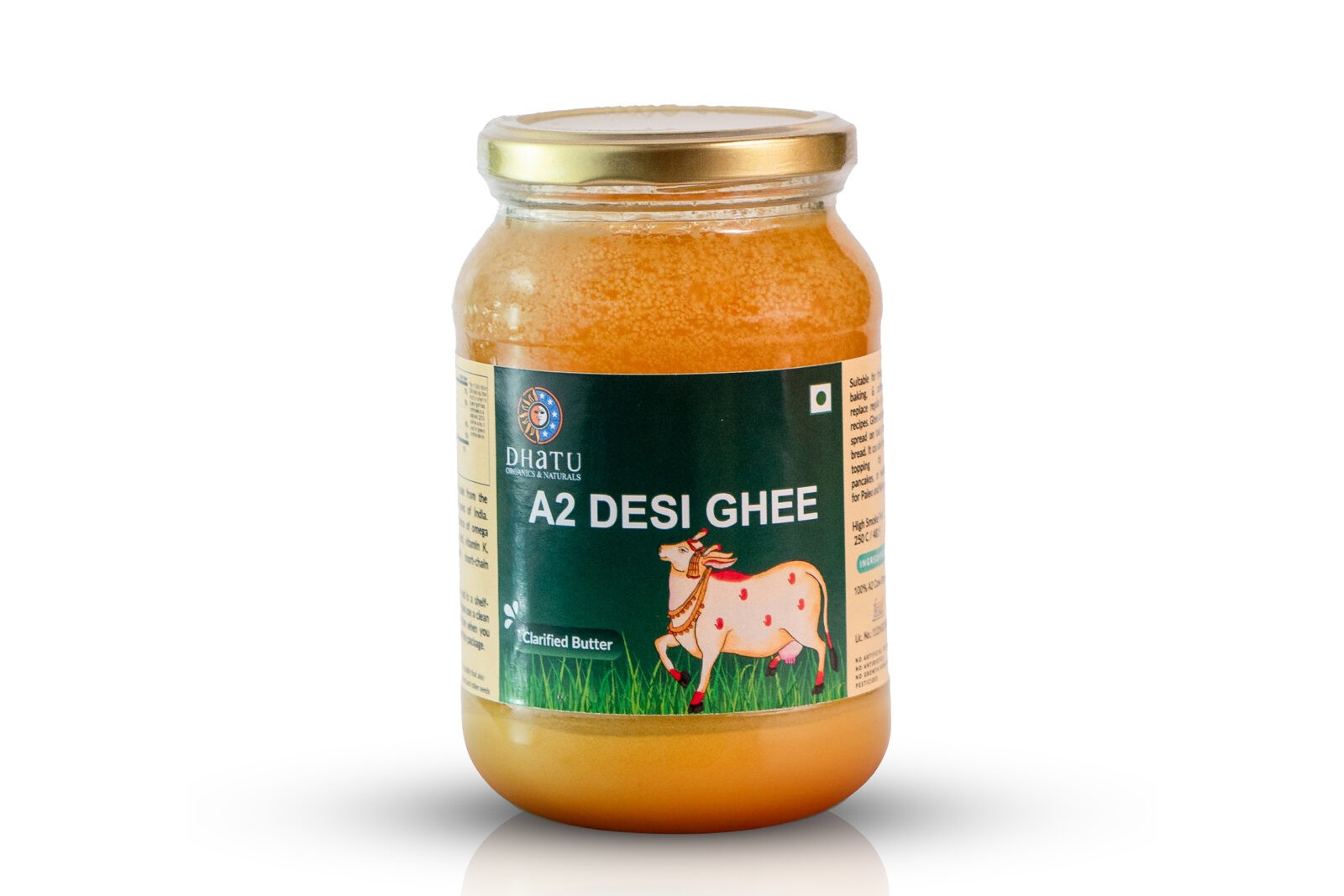 Dhatu A2 ghee is made from milk of indigenous (desi) cows. Prepared using the traditional method where milk is curdled and then hand churned to separate butter. Butter is melted to form ghee. Desi cow milk is known to contain majorly the beneficial A2 Beta Casein protin and hence termed as A2 Ghee.
