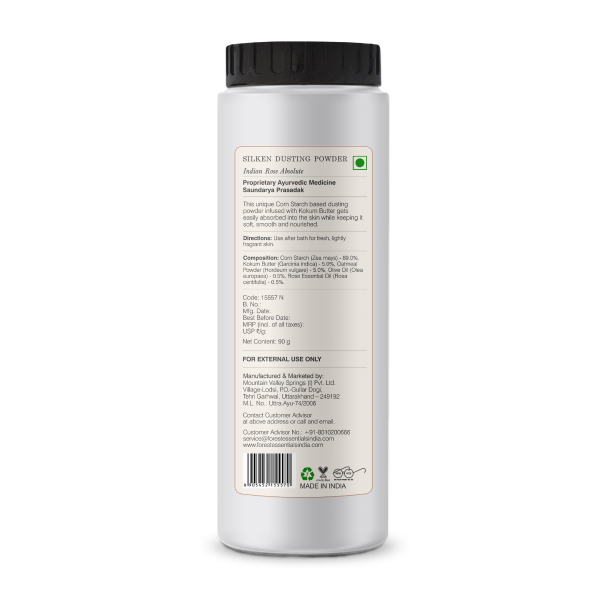 - The Forest Essentials Silken Dusting Powder Indian Rose Absolute is a corn starch-based powder, which is 100% natural, highly absorbent and leaves the skin smooth and refreshed. It is infused with the essential oil of Desi Damask Roses to envelop the skin in an intoxicating fragrance.