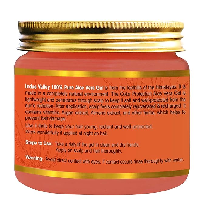 - Valley’s Colour Protection Aloe Vera Gel is an innovative concoction that is specifically designed to protect your natural hair colours to make them look more lustrous and vibrant. The gel also enhances the colouring effects of natural herbs like Henna and Indigo, making their colours darker and longer lasting when applied after the herbal paste has been washed off. So much so that it also works as a convenient replacement for the Aloe Honey Gel that is provided with the Damage-Free Gel Hair Colours. Carefully crafted in special facilities, under expert guidance, 6000 ft above sea level in the foothills of the Himalayas, natural extraction processes are employed to extract the essence of the herbs in their purest form. 4 essential handpicked herbs, namely Aloe Vera, Argan, Almond and Wheat Germ are used to make the body of the gel. The herbs are all organically grown to keep even the fertilizer and pesticide residues at bay. Supported by organic compounds and additives the gel not just adds shine and lustre to your natural hair, but also deep nourish and strengthen the chemical-treated hair from roots, while protecting your hair and scalp from external damage factors like the sun’s UV rays, dirt, pollution, etc.