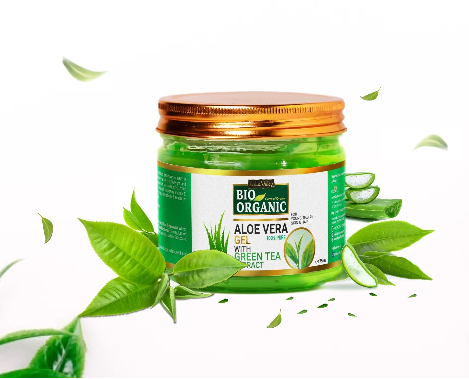 - Indus Valley Bio Organic Aloe Vera Gel is a 100% pure and naturally extracted gel from aloe vera plants that are organically grown and certified in the lower foothills of the Himalayas. With the goodness of 6 natural ingredients this aloe vera gel helps nourish and hydrate the skin and hair from deep within. It gets its soothing green colour from organic Green Tea extract, while its superbly enchanting aroma comes from Rose Water. Green Tea helps reduce acne and ageing signs. Rose water keeps the skin hydrated and clean. You can use Bio Organic Aloe Vera Gel to reduce acne scars, stretch marks, prevent wrinkles, remove bacteria and fungi from hair and scalp and deep cleanse the dirt impurities leaving your skin and hair healthy, i.e. it’s one product with multiple uses and benefits.