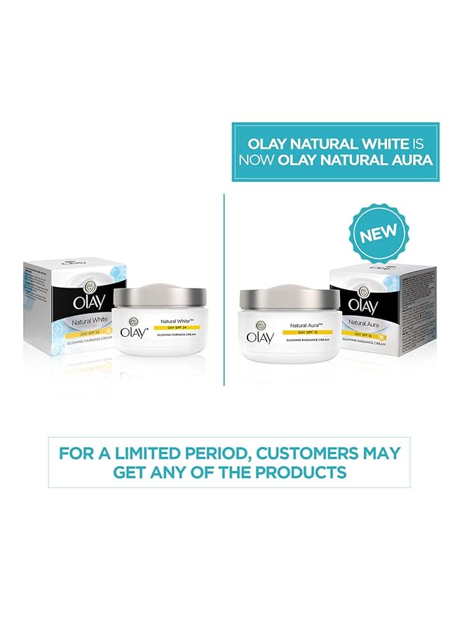 Olay Natural White Day Glowing Fairness cream nourishes and helps protect your skin with added fairness benefits. Your skin is vulnerable to the sun's UV rays and signs of skin darkening during the day, Olay Glowing Fairness cream helps prevent skin tanning and gives you soft, glowing and brighter looking skin.It is powered with a Tri-Vitamin boost of B3, Pro-B5 and E and SPF 24/PA++, which works on skin renewal and gives anti-oxidant protection for natural glowing fairness and much more healthier skin.