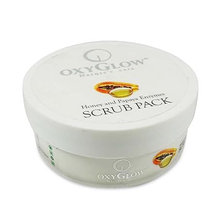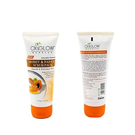 - Oxyglow Herbals Honey & Papaya Scrub Pack contains Papaya Extract, Honey, Vitamin E, Almond, Glycerine, and Jojoba oil. It cleanses and purifies the skin and unclogs pores. It removes dead skin cells from your face without damaging the skin. This scrub pack is enriched with papaya enzymes and honey, which are naturally active skin rejuvenating agents and help delay skin ageing, fade tan and clear pigmentation from the skin. This scrub ensures deep cleansing of skin by removing dirt and dead skin cells, leaving you with rejuvenated, smooth and clean skin. It is suitable for all skin types and does not irritate the skin.