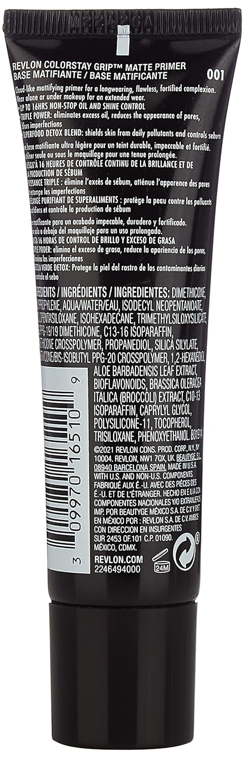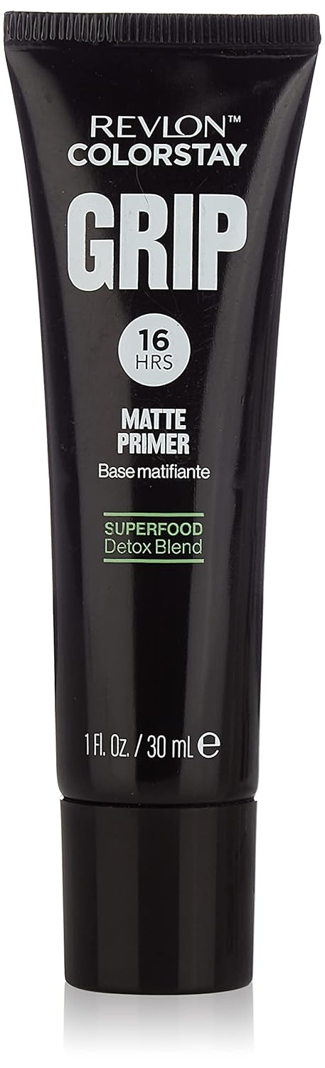 - Revlon ColorStay GRIP Matte Primer primes, mattifies, and improves your makeup wear for up to 16 hours. The lightweight, buildable formula grasps onto your makeup without letting go all day. Triple-power action mattifies, controls excess sebum by absorbing oil, reduces the appearance of pores, and blurs imperfections for perfected, flawless matte skin. Infused with a superfood detox blend of citrus + aloe + broccoli that protects skin against the effects of daily aggressors including blue light, environmental stress and pollution by neutralizing free radicals. The formula is non-tacky with a non-drying feel. Free from added parabens, phthalates, and mineral oil.