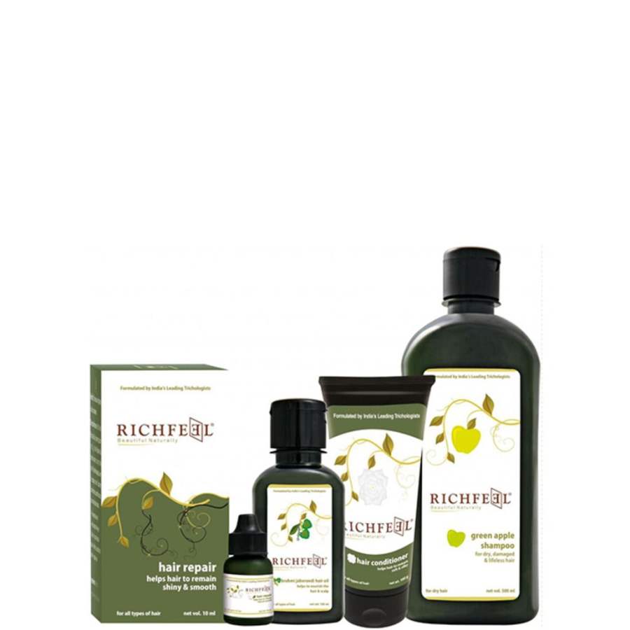 Get conditioned moisturised tresses that look and feel healthy with this Richfeel combo kit for dry hair. This kit consists of green apple shampoo, hair conditioner, Brahmi jaborandi hair oil and hair repair.