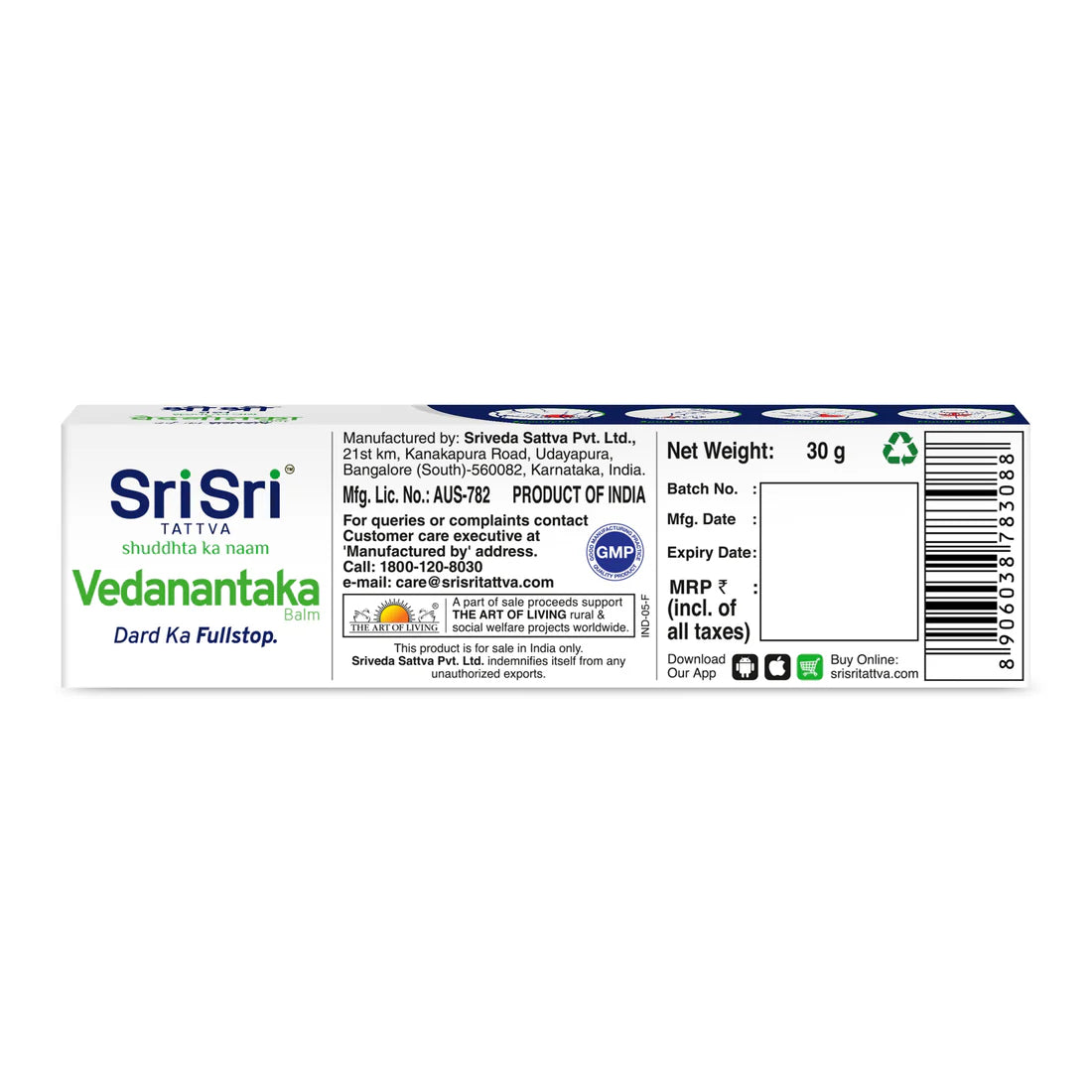 Sri Sri Tattva Vedanantaka Balm contains several herbs as active ingredients. The balm provides relief from various types of pain like muscle aches and arthritic pain.