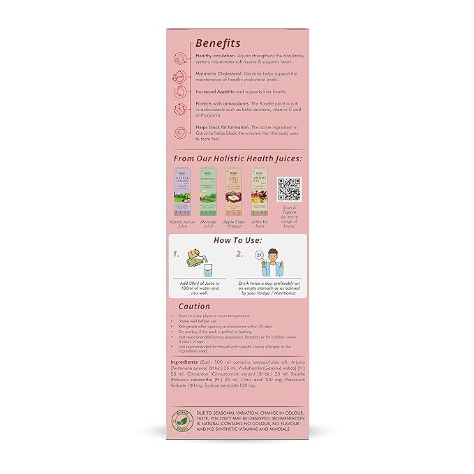 Sri Sri Tattva Arjuna Garcinia Juice is an ayurvedic health tonic that helps maintain cardiac health. It helps maintain a healthy cholesterol level and helps improve blood circulation. It is GMP-certified and free from added sugars and chemicals.