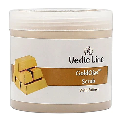 - Vedicline Gold Ojas Scrub assists to nurture your skin from the inside out and also assists in keeping the skin lustrous, firm and youthful-looking at all times.