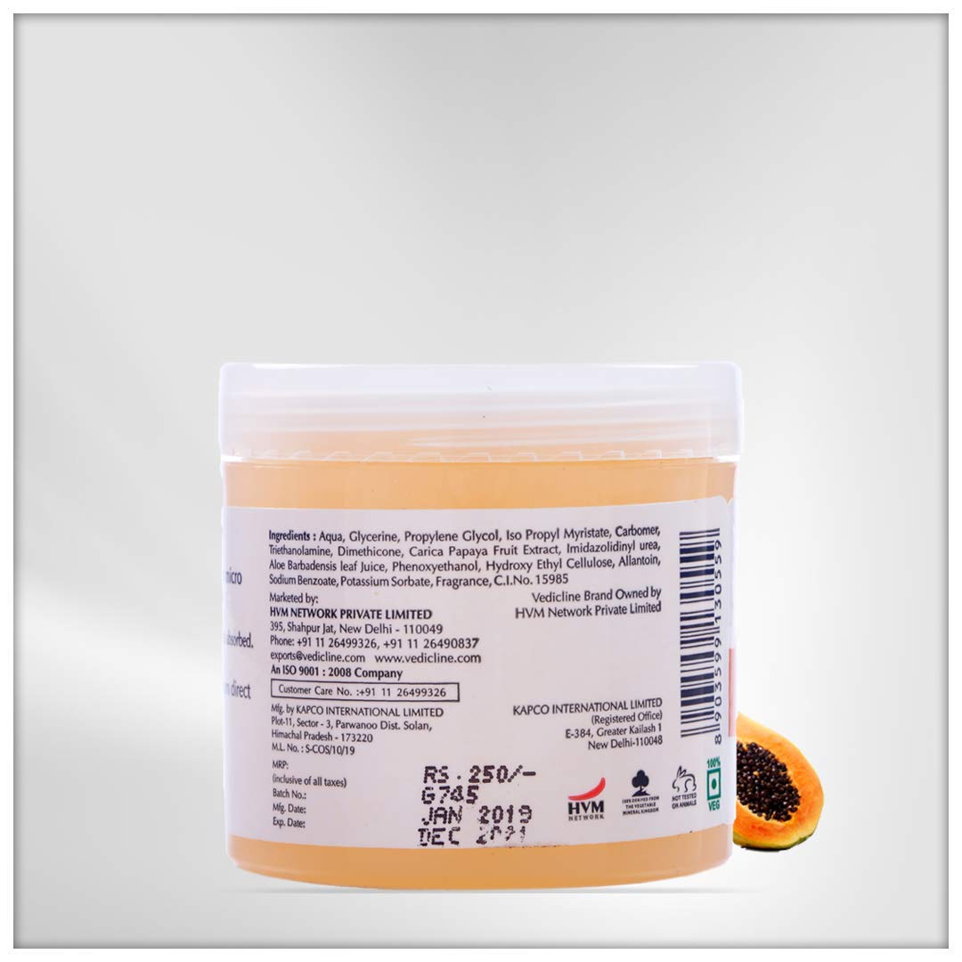 - Vedicline Papaya Gel offers the skin a burst of freshness by promoting fairness also reduce pigmentation, skin inflammation, scars & blemishes for more clear skin.