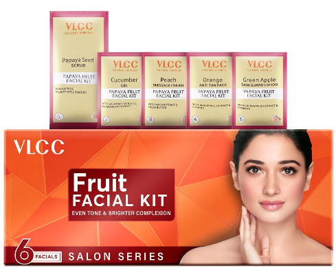 - VLCC Fruit Facial Kit is formulated with fruit and vegetable extracts like watermelon, peach, orange and cucumber, along with Papaya, this Fruit Facial Kit helps achieve a blemish-free, radiant complexion. Papaya, often referred to as the “fruit of the angels" is a rich source of an enzyme called "papain" and vitamin A, which together help in breaking down inactive proteins and thereby sloughing off dead skin cells. It also hydrates the skin and adds a natural luminosity.