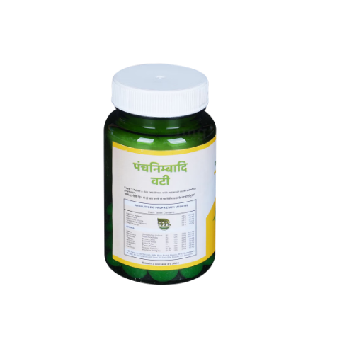 Vyas Panchanimbadi Vati is a potent ayurvedic formula that supports the skin's wellness. It is antimicrobial and antibacterial. It may help in cases of wounds.